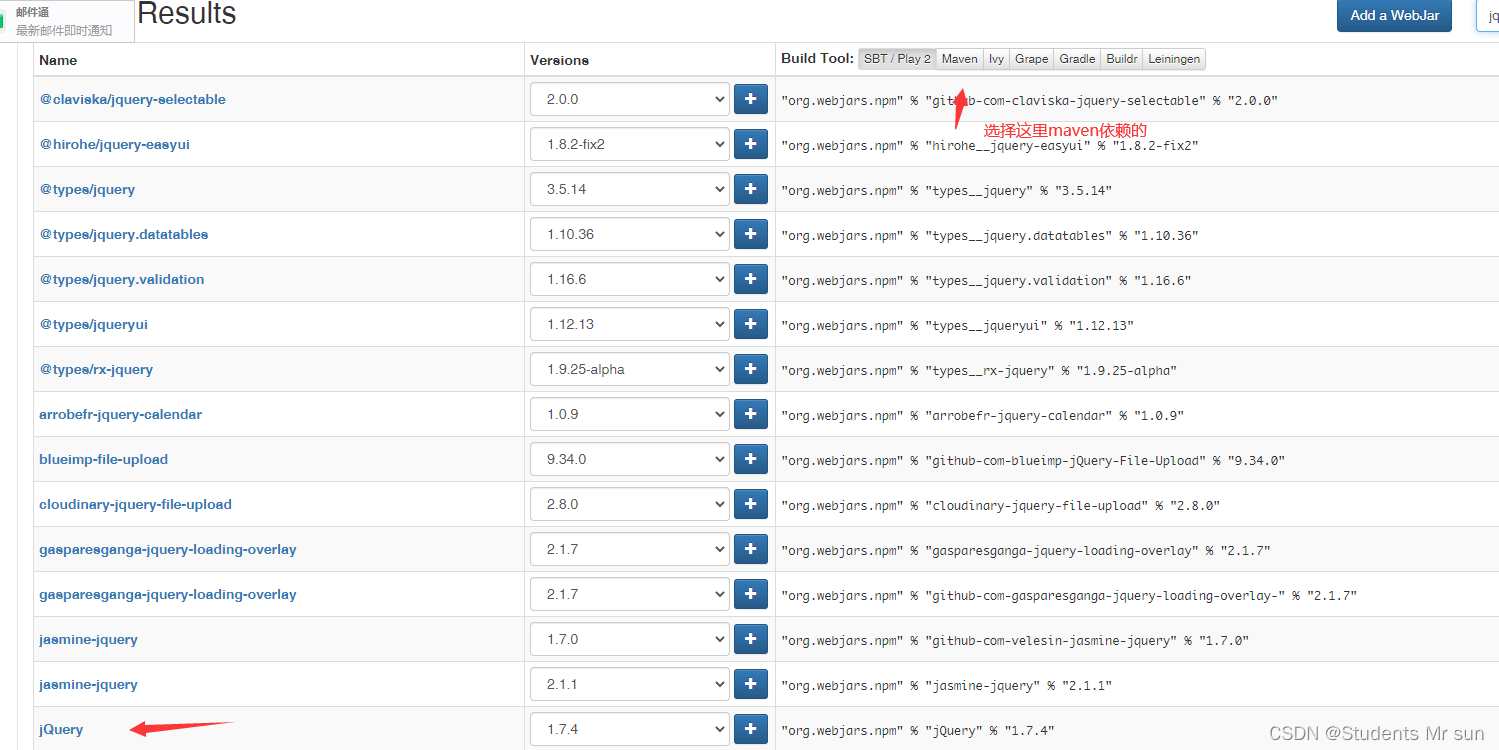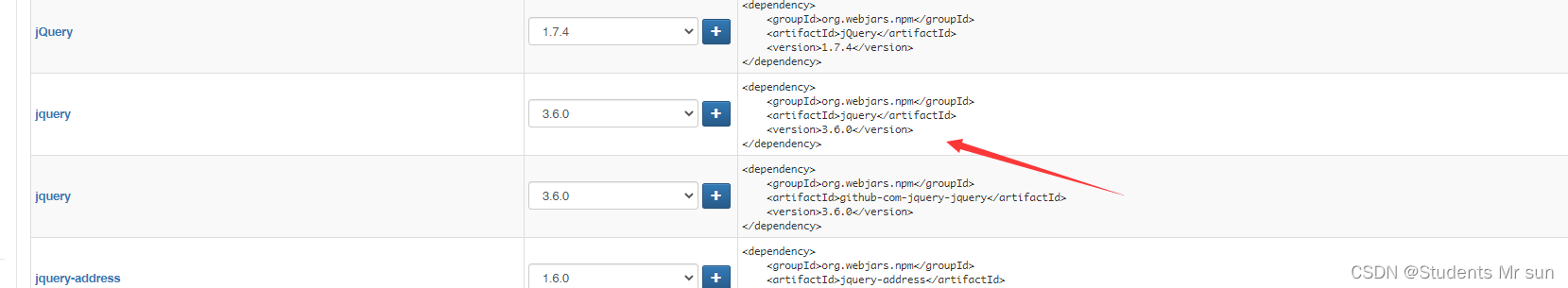 <!-- <!‐‐引入jquery‐webjar在访问的时候只需要写webjars下面资源的名称即可‐‐> --> <dependency> <groupId>org.webjars.npm</groupId> <artifactId>jquery</artifactId> <version>3.6.0</version> </dependency>