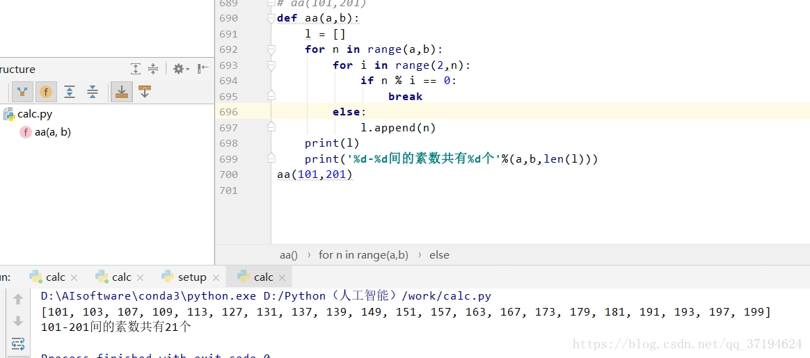 def aa(a,b): l = [] for n in range(a,b):#任意a,b区间 for i in range(2,n): if n % i == 0: break else: l.append(n) print(l) print('%d-%d间的素数共有%d个'%(a,b,len(l)))