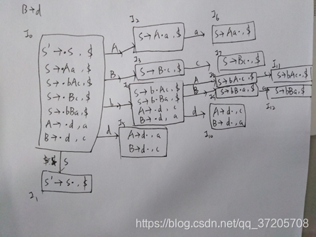 求闭包:对每个项A->α•Bβ,a 将B->•γ, b加入到项目集中,其中b=FIRST(βa),如果β∉ε(即没有),则b=FIRST(β),否则b= FIRST(β)∪a(注意这里是β而不是B)