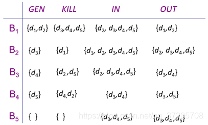 该过程是一个迭代的过程(直到IN OUT集合不再变化),首先直接得出各基本块的gen和kill集(还有初始时各基本块的OUT集),然后从上往下分析。