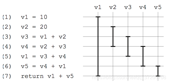 这里只介绍一种简单的方法,将控制流图线性化,分析出各个变量的活跃区间(看出来?)