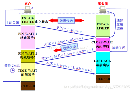 1.先由A向B发送一个FIN=1并带上自己的序列号seq = u,请求关闭数据传输。