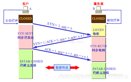 假设主机A运行的是TCP客户程序,而B运行TCP服务器程序。最初两端的TCP进程都处于CLOSED(关闭)状态。图中在主机下面的方框分别是TCP进程所处的状态。在本例中,A主动打开连接,而B被动打开连接。