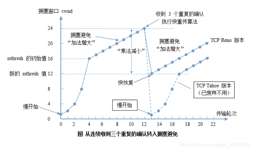 当发送发连续接收到三个重复确认时,就执行“乘法减小”算法,把慢启动开始门限(ssthresh)和cwnd减半,然后执行拥塞避免算法,使拥塞窗口缓慢增大。