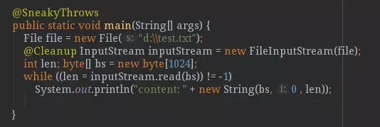@Cleanup:自动关闭资源,针对实现了java.io.Closeable接口的对象有效,如:典型的IO流对象