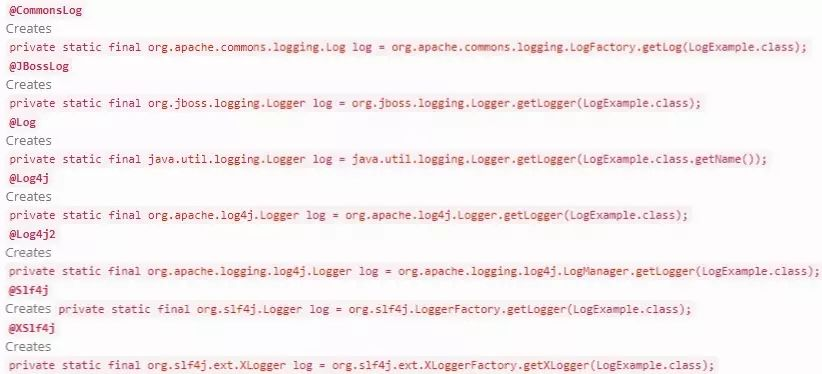 @Log:作用于类上,生成日志变量。针对不同的日志实现产品,有不同的注解: