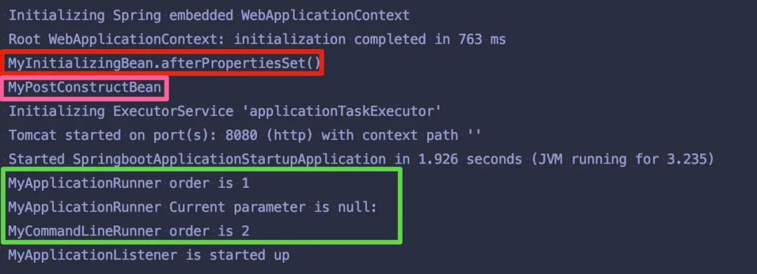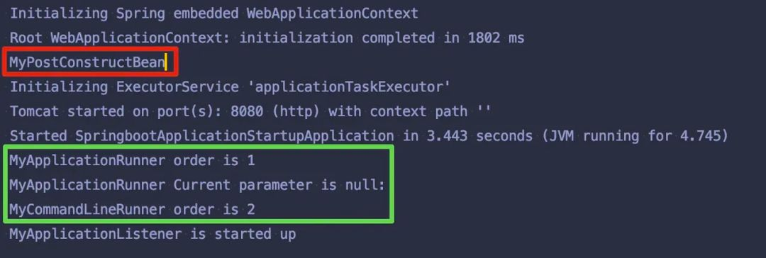 ApplicationReadyEvent当且仅当 在应用程序就绪之后才被触发,甚至是说上面的 Listener 要在本文说的所有解决方案都执行了之后才会被触发,最终结论请稍后看代码中我用