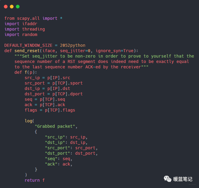 编写一个攻击程序,使用 Python 网络库 scapy 来读取两个终端窗口之间交换的数据,并将其打印到终端上。代码比较长,下面为一部份,完整代码后台回复 TCP攻击,代码的核心是调用 scapy 的嗅探方法: