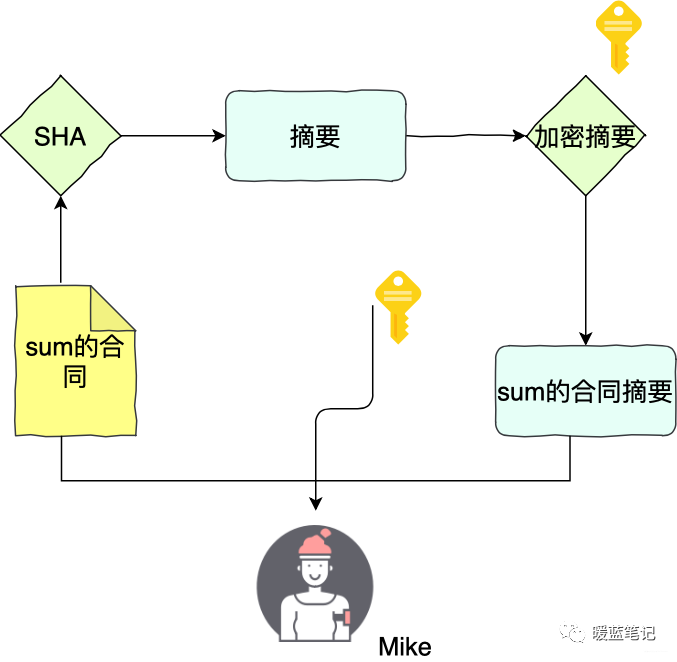 同样的,举个例子。Sum 和 Mike 两个人签合同。Sum 首先用 SHA 算法计算合同的摘要,然后用自己私钥将摘要加密,得到数字签名。Sum 将合同原文、签名,以及公钥三者都交给 Mike