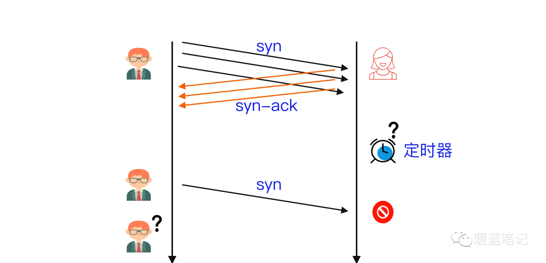 假设 B 通过某 TCP 端口提供服务,B 在收到 A 的 SYN 消息时,积极的反馈了 SYN-ACK 消息,使连接进入半开状态,因为 B 不确定自己发给 A 的 SYN-ACK 消息或 A 反馈的 ACK 消息是否会丢在半路,所以会给每个待完成的半开连接都设一个Timer,如果超过时间还没有收到 A 的 ACK 消息,则重新发送一次 SYN-ACK 消息给A,直到重试超过一定次数时才会放弃。