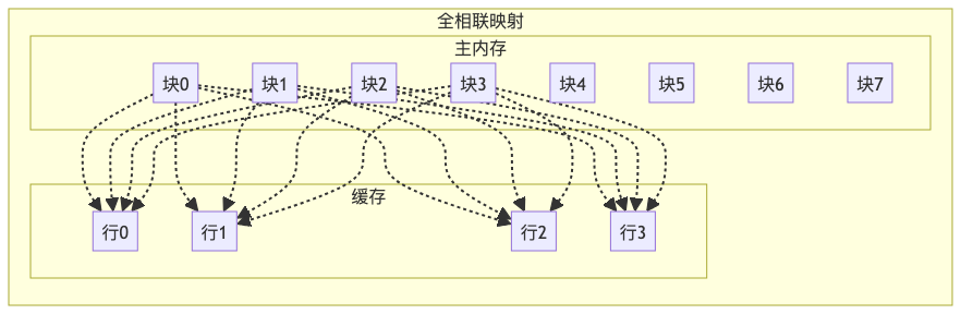 - 全相连映像:同样划分成块并且编号,cache中的任意一块都可以与主存的任意一块对应,主存中的内容可以随意调入cache,只有cache满了才会发生冲突,是最不容易发生冲突的映像方式。
