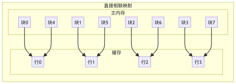 - 直接映像:将Cache存储器等分成块,主存也等分成块并编号,主存中的块和Cache中的块的对应关系是固定的,即二者块号相同才能命中,地址转换简单但是不灵活,容易造成资源浪费。