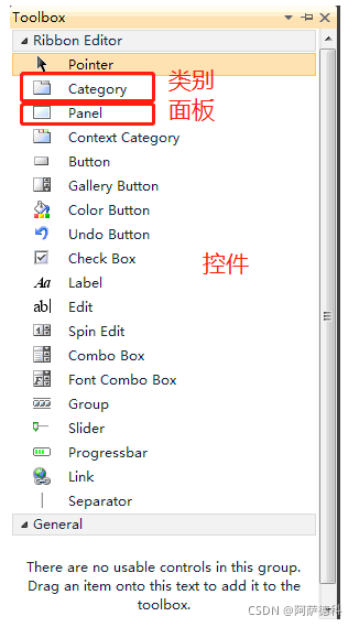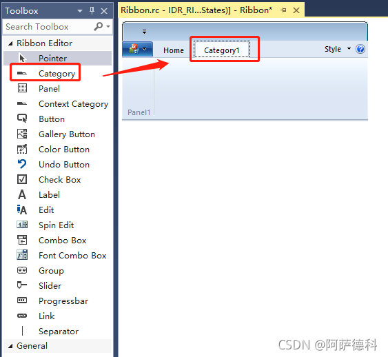 选择Category拖入Ribbon bar,放到Home类别的后面,可以看到它的默认名称为“Category1”,并且默认带了一个面板“Panel1”