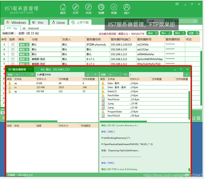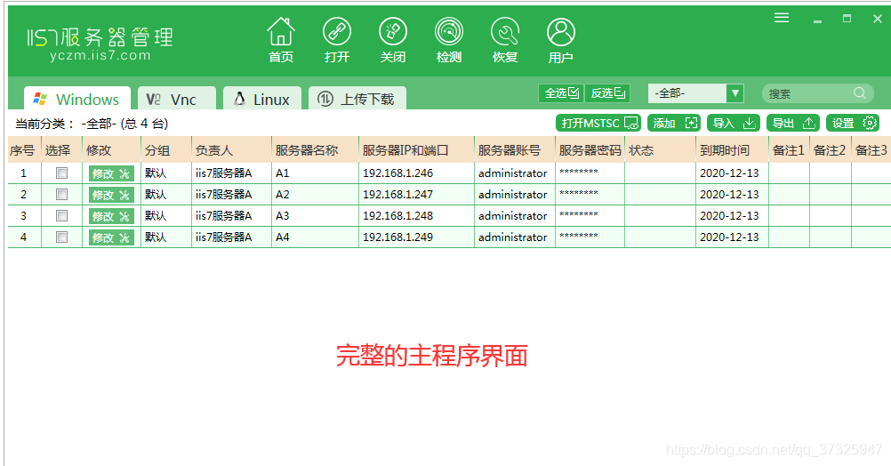 iis7服务器管理工具(曾用名:IIS7远程桌面),适用群体为:机房管理、站长、运维工作、程序员,等需要大量服务器或者电脑的用户朋友。该软件是跨平台使用的,支持windows,linux等系统。
