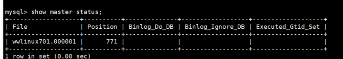 查看主库状态并记下FIle 和 Position 参数,我这里是wwlinux701.000001 和 771