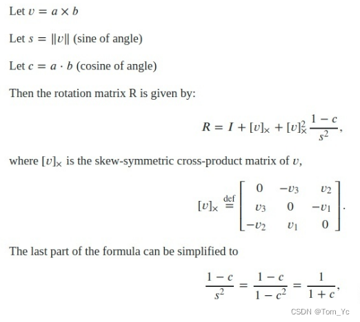 项目遇到一个问题,就是需要根据原始向量和目标向量求他们两个之间的旋转矩阵,网上结果很少,也有很多错误,因此写了一个,项目中使用过程没出现问题。