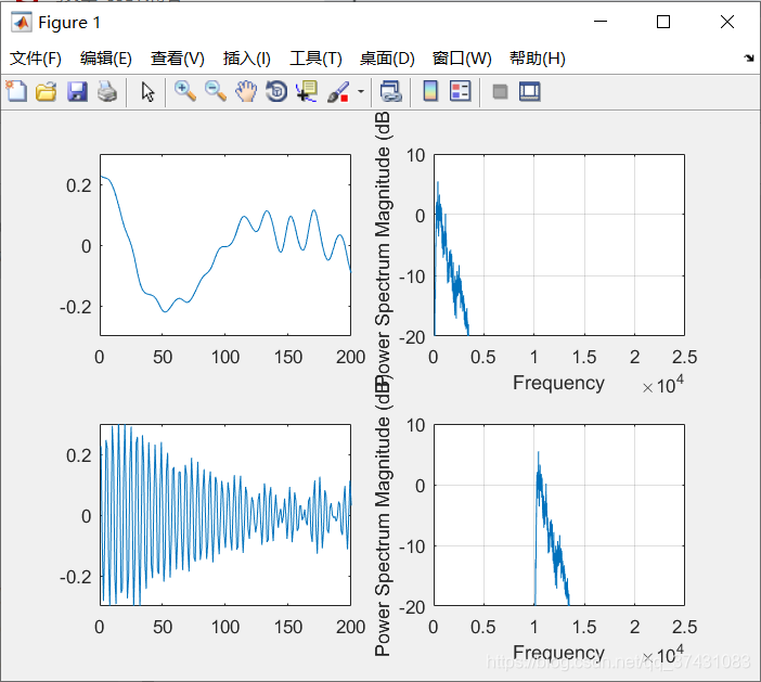 subplot(2,2,4); psd(SSB_OUT, 10000, Fs); axis([0 25000 -20 10]);