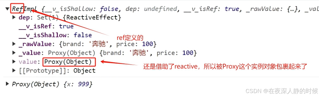 2.其实用ref去定义对象类型的数据,最底层还是借助了reactive去给对象做代理,这是个小细节,如图: