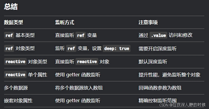 7.watch监视ref或者reactive包裹的数据有很多种写法和注意事项,建议全用ref就不会有以下的那么多情况了,但是所有情况也需要了解下,万一是读别人的代码呢?如图: