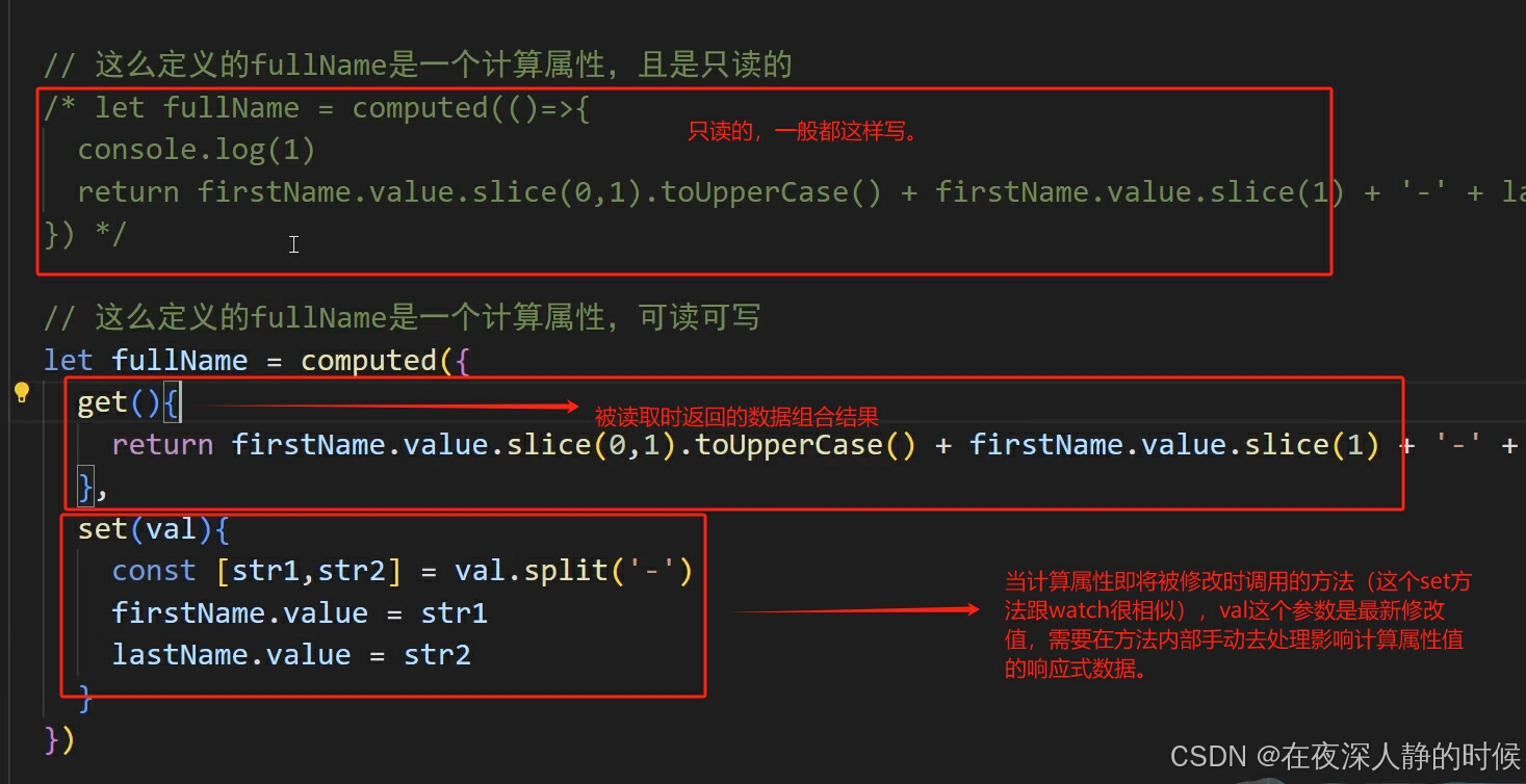 5. 计算属性有两种写法,一种是简写形式,只读的;另外一种是可读可写。如图: