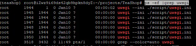 然后我通过ps -ef |grep uwsgi检查uwsgi检查进程发现