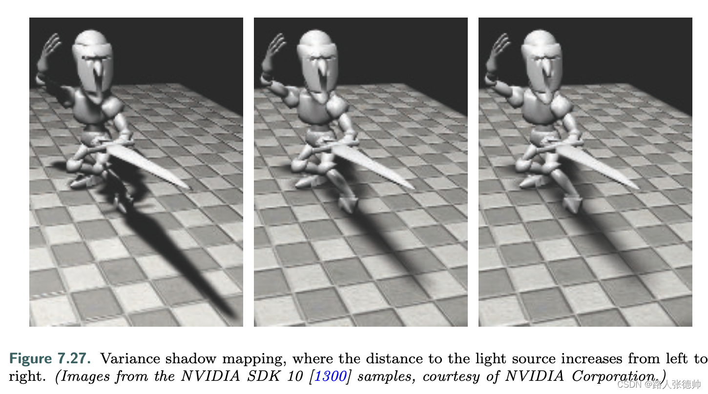 一种允许过滤 shadow map 的算法 叫 variance shadow map (VSM) [368]. 这种算法 在一张map 中存储深度值,另一个map 中存储 深度值的平方,在生成map 时,可以使用 MSAA or 其他的抗锯齿算法,这些map 可以被blurred, mipmapped, 然后放进一个 summed area tables 里[988], 将这些地图视为可过滤纹理的能力是一个巨大的优势,因为当从这些地图中检索数据时,可以使用整个阵列的采样和过滤技术。