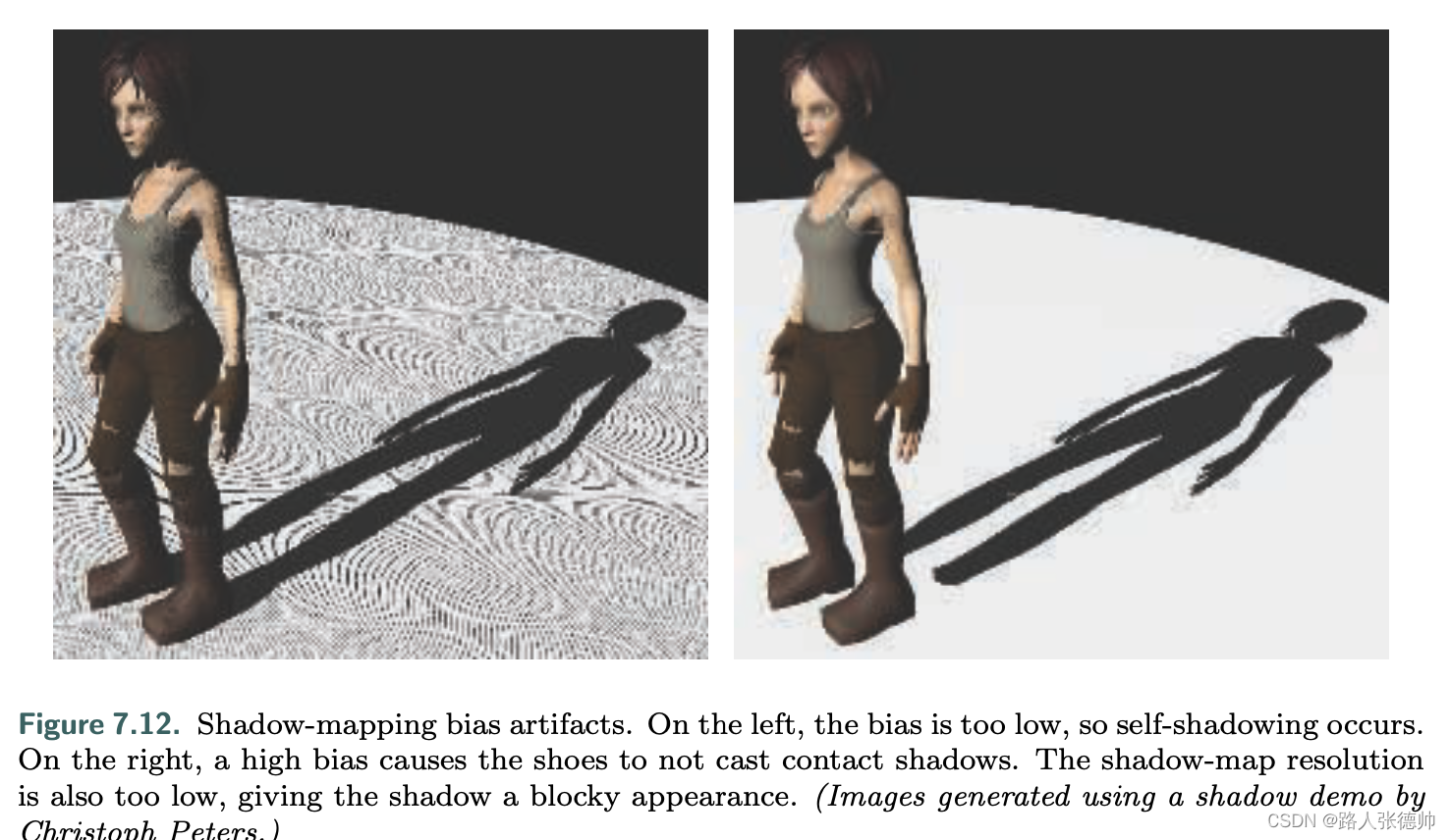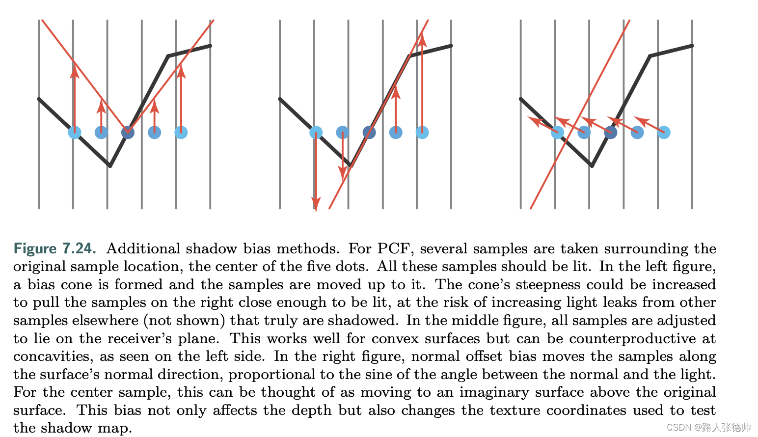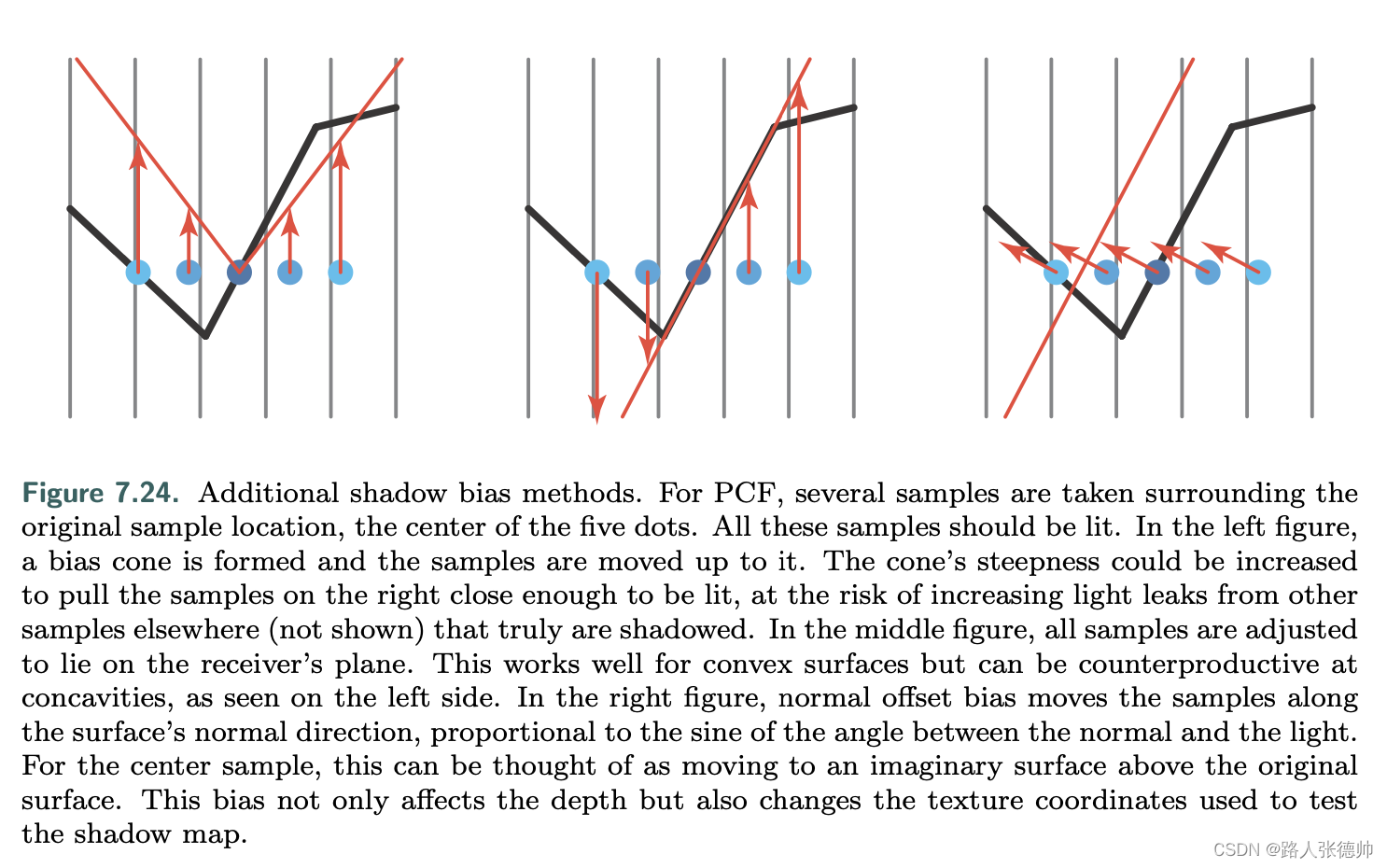 这改变的不仅仅是深度值,还有在shadow map 中进行采样点的uv 坐标,当光源与法线的角度增加时,bias 也会增加,从而避免self-shadow