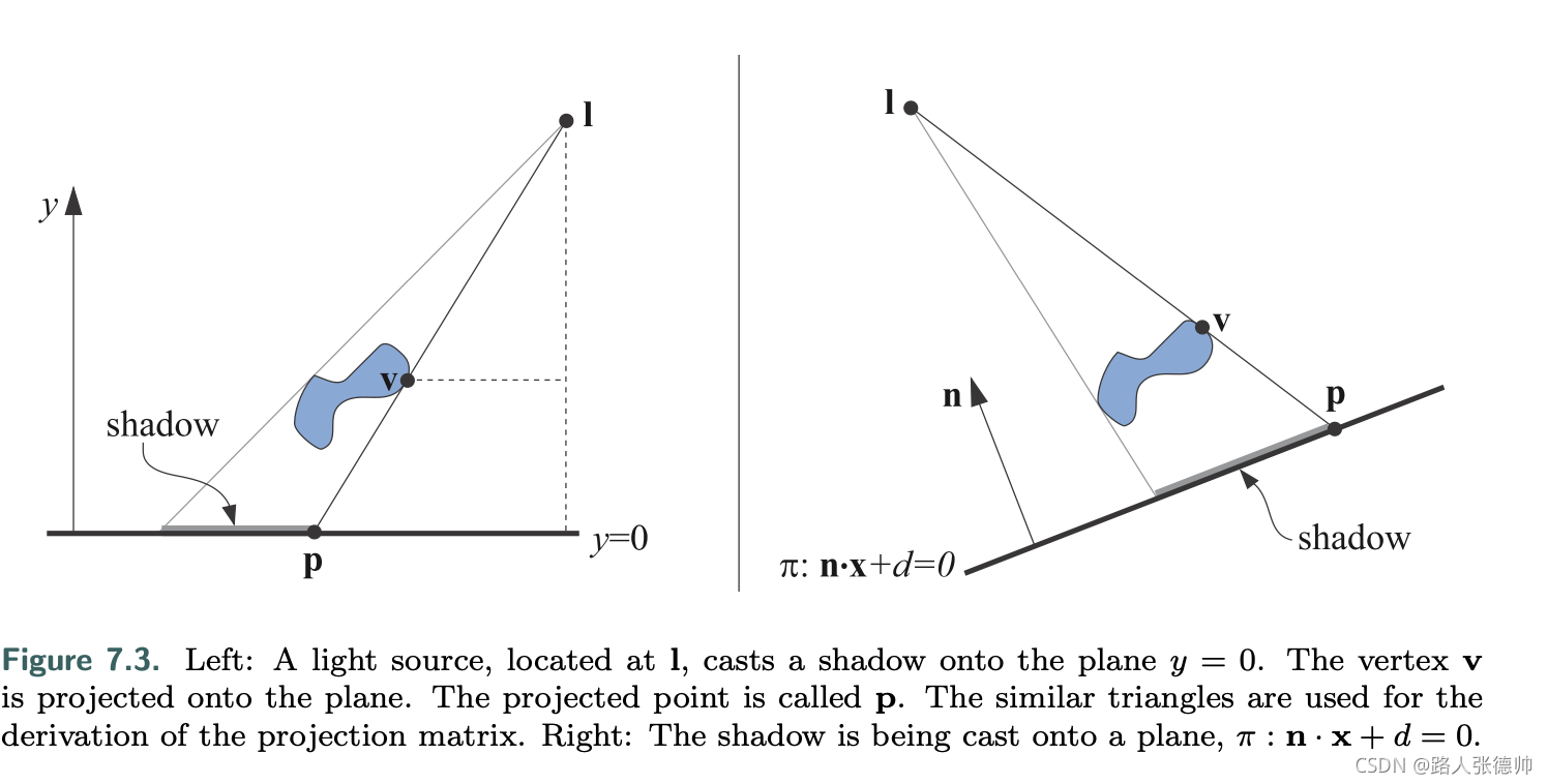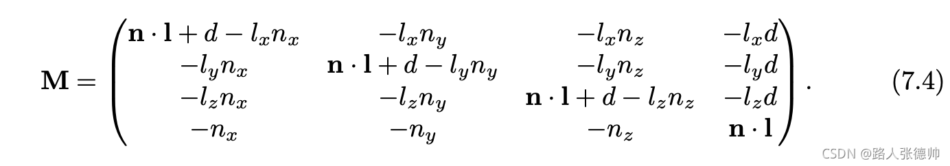 然后并不都是投影到y=0的平面,而是π=n*x+d的平面 ,则投影矩阵是: