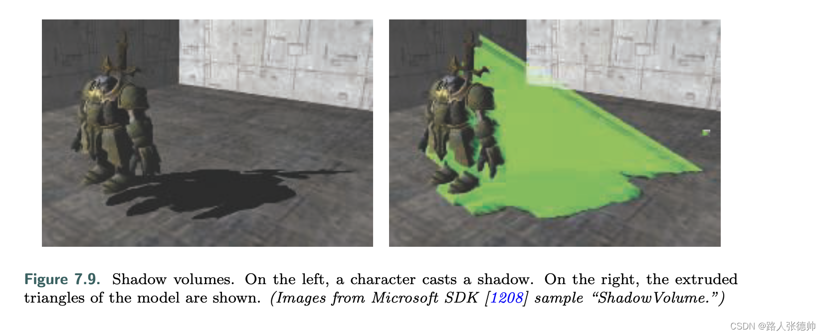Presented by Heidmann in 1991 [701], 提出了基于 Crow’s shadow volumes [311] 通过使用stencil buffer 投射阴影 . 这种方法任何GPU上都可以使用,因为只需要一个stencil buffer,它不是使用阴影纹理,所以避免了采样问题,从而产生.正确的sharp shadows. 缺点是 比如 一个角色的衣服有褶皱,很薄,硬阴影效果不好 , Shadow volumes 因为性能不稳定,所以当下很少用了