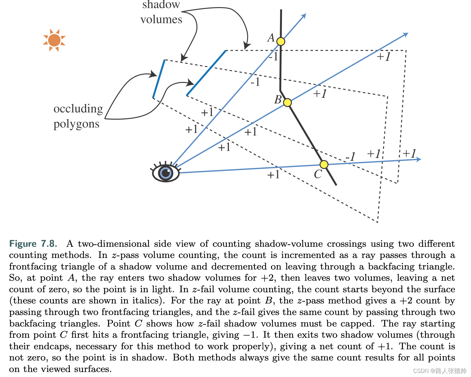 用射线来检测是非常耗时的,我们有更好的方法,利用stencil buffer,它可以帮我们计数,首先清空stencil buffer,然后 绘制场景中没有被光照的物体到Framebuffer中,再从 color buffer 中获取颜色信息,从 z-buffer 中获取深度信息. 然后关闭深度写入,但是仍然深度测试,绘制 shadow volumes 的前面的三角面.在这个过程中 stencil operation 模板测试 当绘制三角形的时候增加它的值 ,第四 执行另一个pass ,这次只绘制三角面的背面,然后这时stencil buffer 减少它的值。