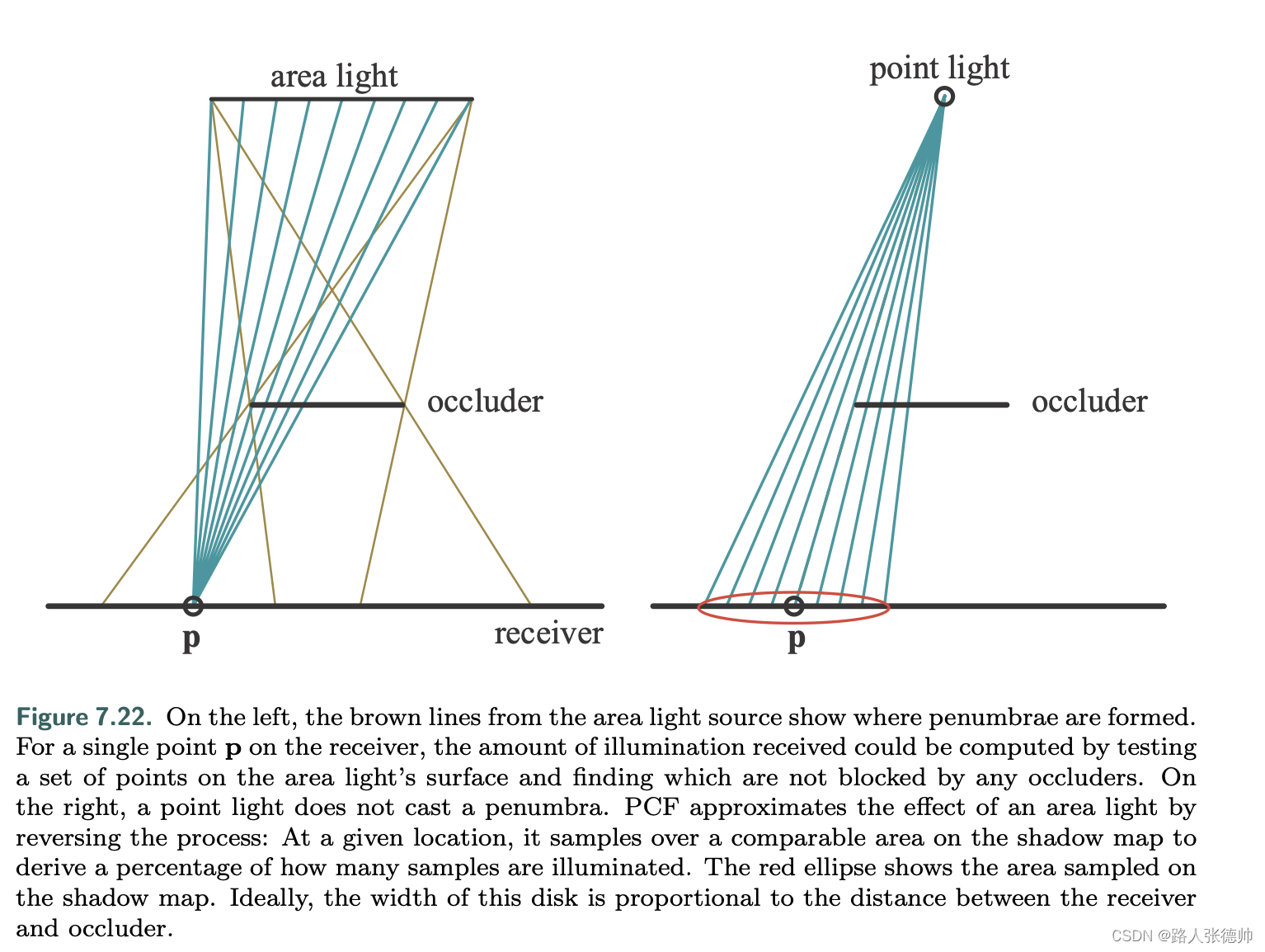 In 2005 Fernando [212, 467, 1252] 提出了一个具有影响力的方法叫 percentage- closer soft shadows (PCSS). 他尝试对 表面位置 在shadow map 中的邻近区域查找所有可能的 occluders. 这些点到 occluders 的平均距离,来决定了采样的宽度:
