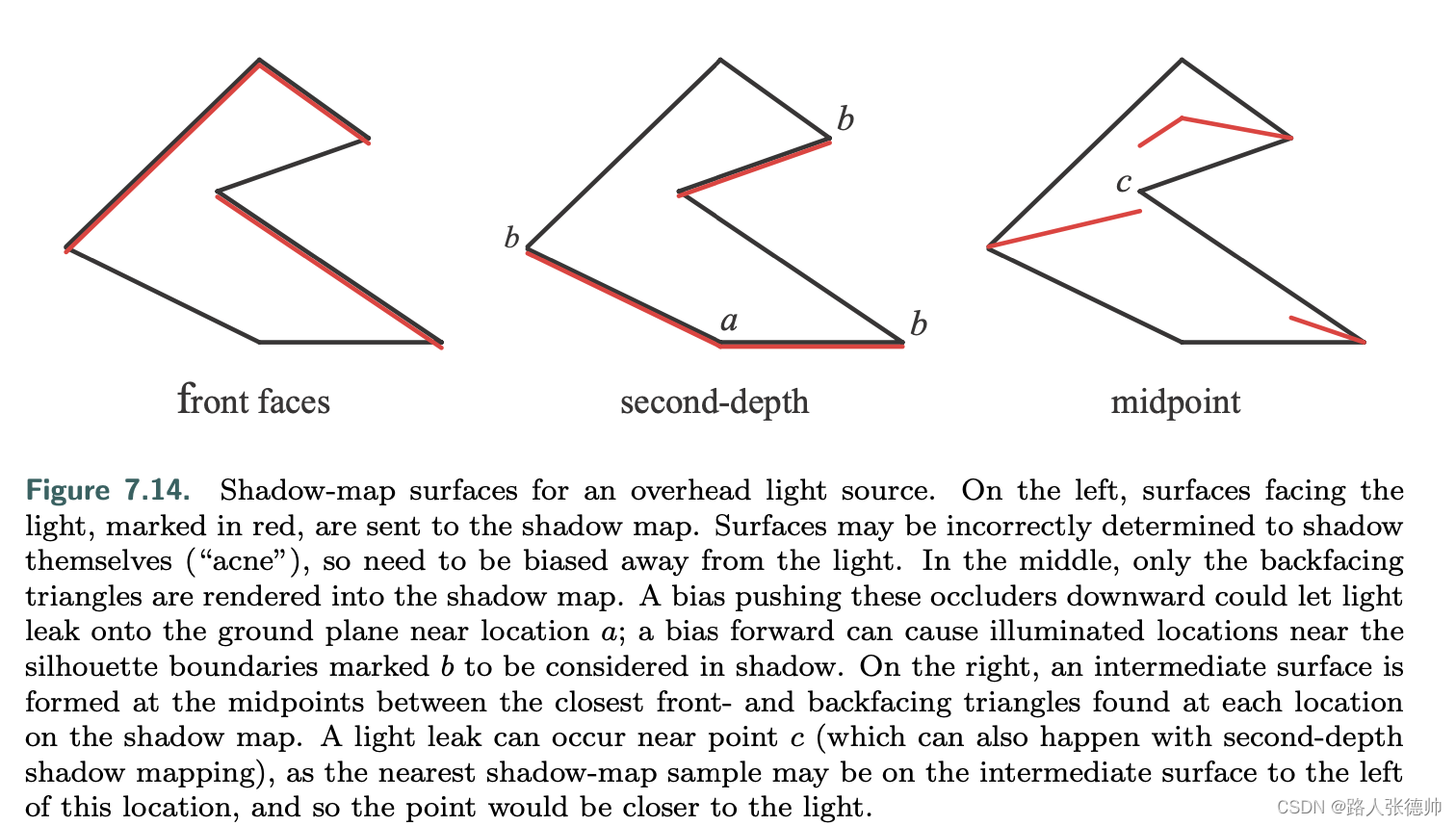 注意 shadow mapping, 渲染的物体必须是不透明的,比如固体,或者必须正面和反面都被渲染到shadow map中,否则物体可能不会完全投射阴影. Woo [1900] 提出一个方法,用正面和反面之间的平面,这种方法是,把固体渲染到shadow map 中,并追踪表面上距离光源最近的两个点 . 这个过程可以通过 深度剥离或其他与透明相关的技术执行,两个物体之间的平均深度形成一个中间层,其深度被用作阴影贴图,有时称为双阴影贴图dual shadow map [1865]. 如果一个物体足够厚,self-shadowing 和 light-leak 就会很小.它的缺点就是用了两张shadow map。