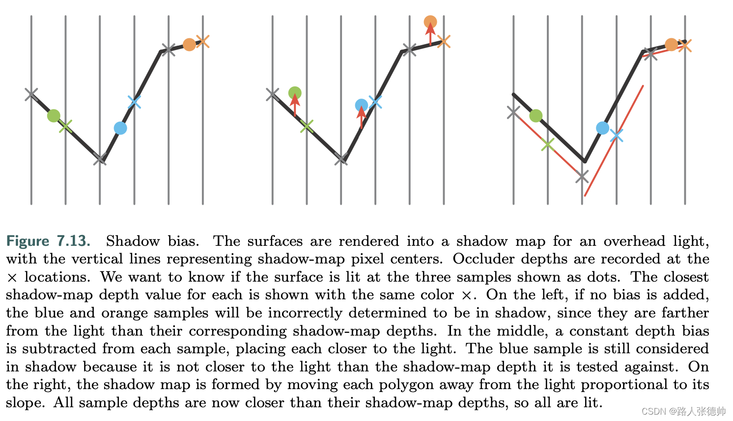 一个缺点是 阴影的质量取决于 shadow mapping 的分辨率 和 z-buffer 的精度,因为shadow map 是在深度值比较之后 再进行采样的,, 该算法容易出现混叠问题,特别是接近物体之间的接触点. 一个普遍问题是 self-shadow aliasing,也叫 “surface acne” or “shadow acne,” ,一个三角形本应该给其他物体投射阴影的,但是它自己也被它产生的阴影投射了,也就是它采样了它自己投射的阴影,这个问题的根源有两个:一是处理器的精度所致,它的深度值和shadow map中的深度值一比较,确实它就应该在阴影中 ,另一个原因是 geometric, 从shadow map 中采样点的深度值,并不能代表该点的深度值,也就是视角观看的点和shadow map 中采样点的位置不是一个,比如 像素通常对它的中心点采样. 如下图: