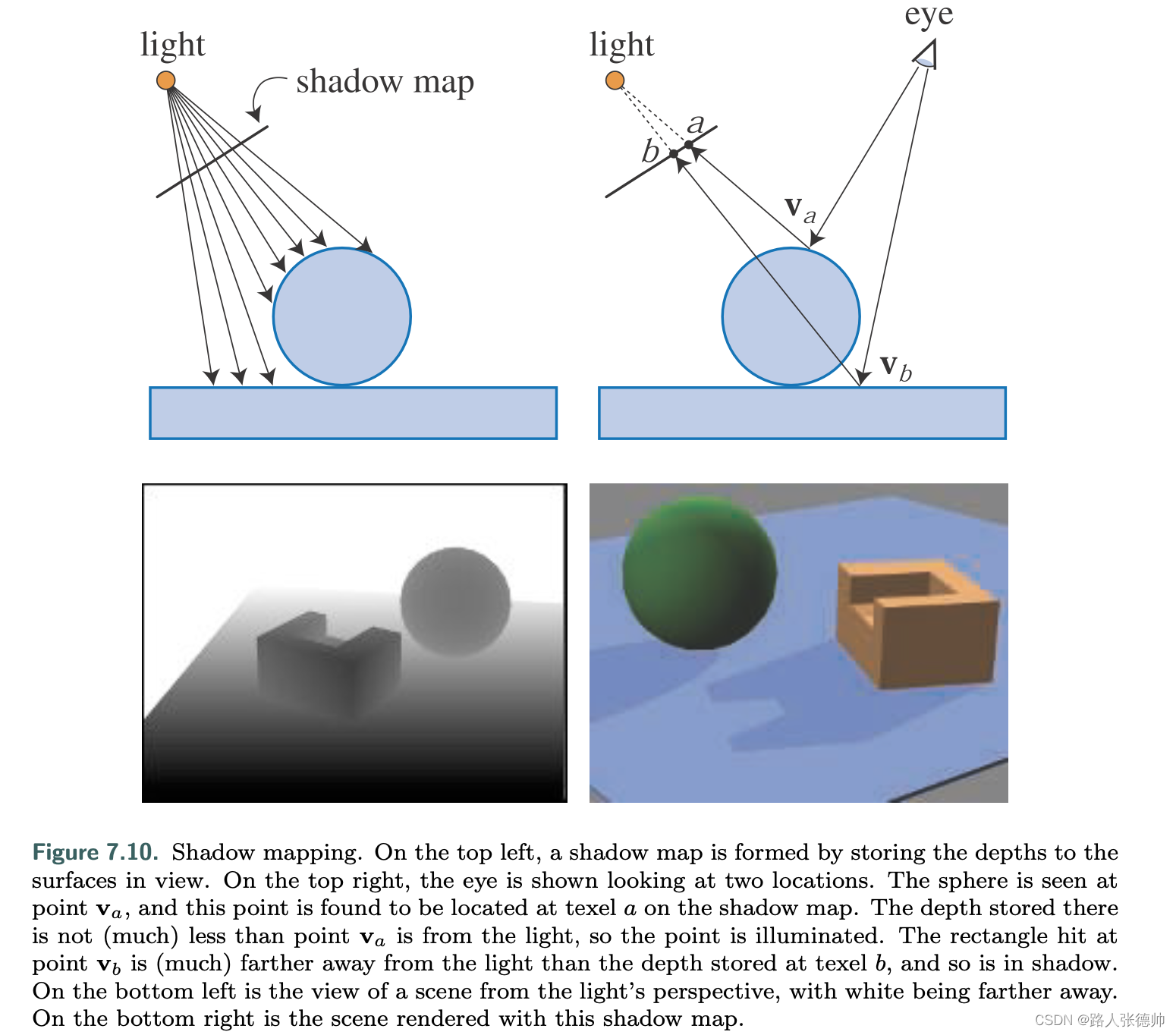 每一个z-buffer中的像素,包含了一个物体上离光源最近的点的深度值,也就是 能看到的 物体表面的点,就像下图一样.我们把整个z-buffer叫做 shadow map, 也叫 shadow depth map 或者shadow buffer. 为了使用阴影贴图,场景需要第二次渲染,但这一次是针对viewer.然后把它在像素上的位置和 shadow map上的位置作比较.如果它的位置要比shadow map 的值大,说明它在阴影中 ,这个技术是通过纹理映射实现的,比如: