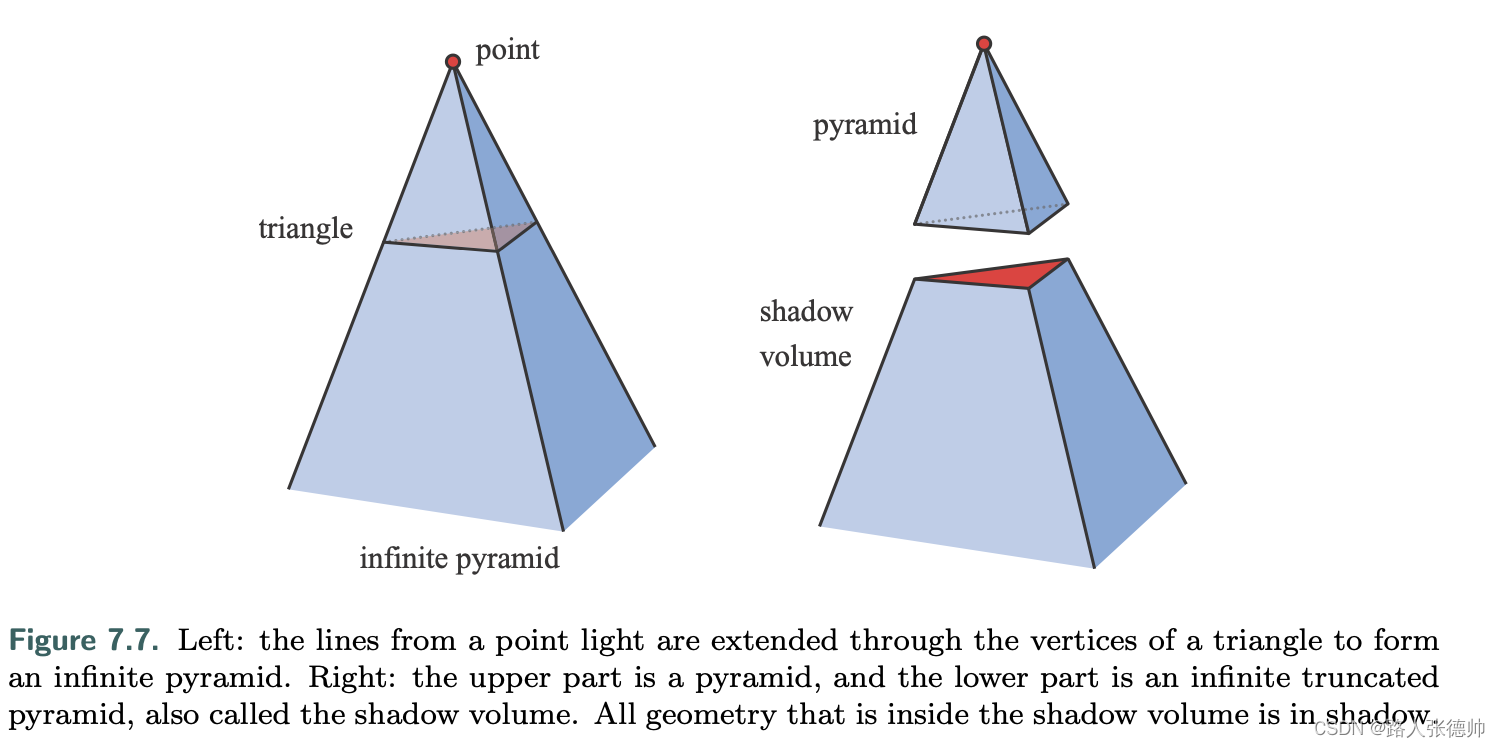从一个点向下投射成一个锥体,被一个三角面分割成两部分,上面部分包括顶点,下面的是一个被截断的锥体,这个顶点就好比光源,任何在截断锥体的物体,就认为在阴影当中,下面的锥体就叫shadow volume.