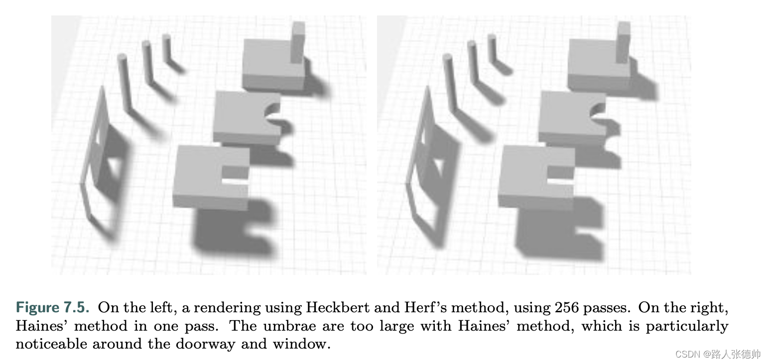 当光源有区域的时候就会出现Soft shadows . 每一个 punctual 光源, 都会渲染一张image,并把它添加到缓存里面,多个光源产生了多个image,这些image 一平均就会生成一张带有soft shadow的image. 理论上,任何生成硬阴影的算法都可以与这种累积技术一起使用来生成半影. 但是比较耗时