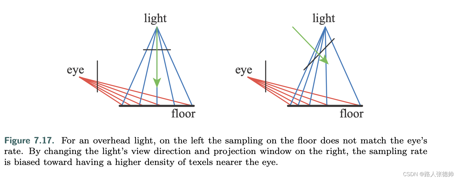 在将光线的视角映射到眼睛的视角时,有22°的自由度 [896]. 通过这种方法解决问题有几种不同的算法,它们试图更好地匹配光线的采样率和眼睛的采样率,包括 perspective shadow maps (PSM) [1691], trapezoidal shadow maps (TSM) [1132], and light space perspective shadow maps (LiSPSM) [1893, 1895]. See Figure 7.15 and Figure 7.26 on page 254 for examples. 这类技术叫做 perspective warping methods.