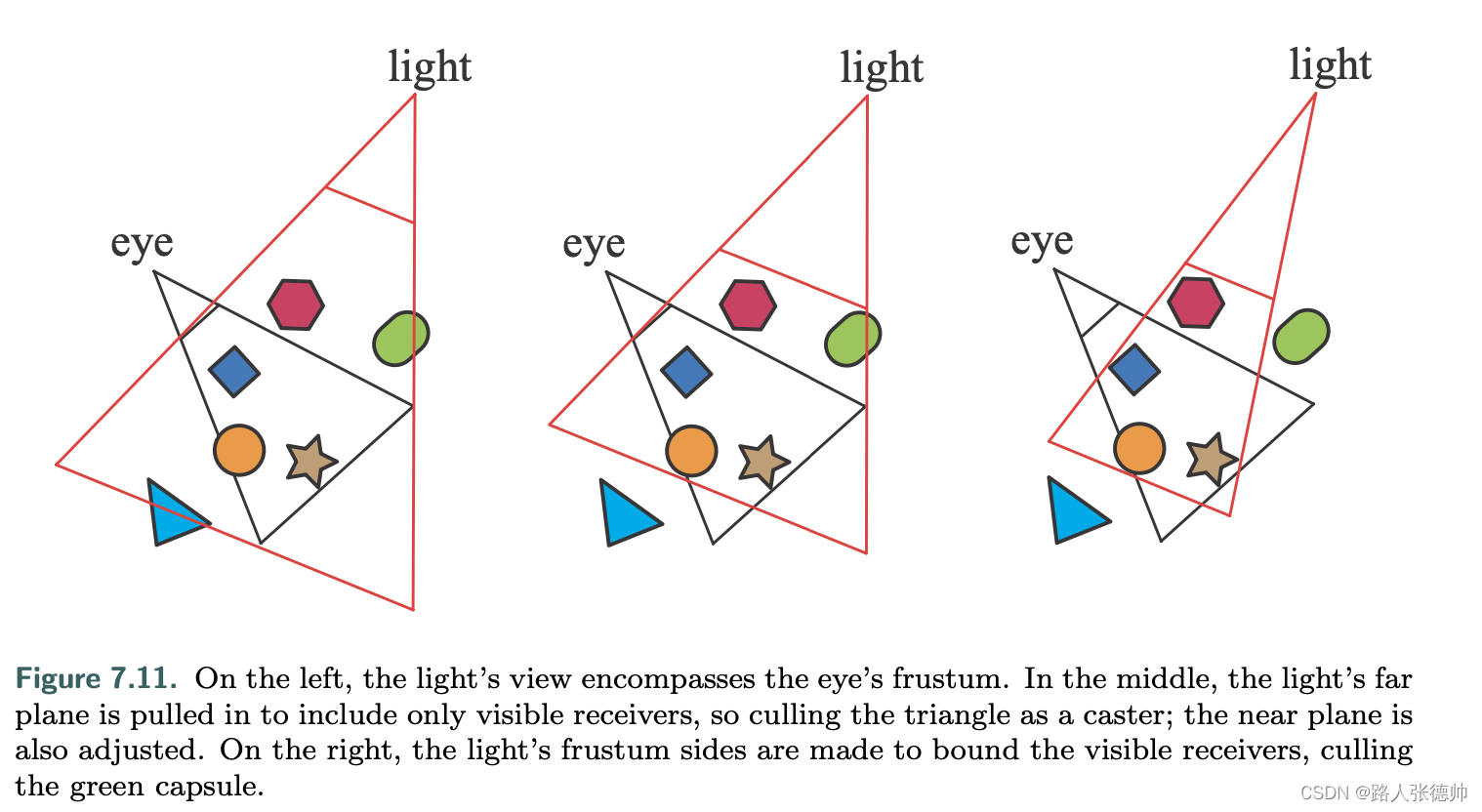 如上图中.凡是超出 view frustum 的物体也不投射阴影,来动态的调节light volume 的大小. 只渲染看得见的物体的阴影,不仅仅能节省时间,还能提高阴影贴图的分辨率,从而提高阴影的质量.
