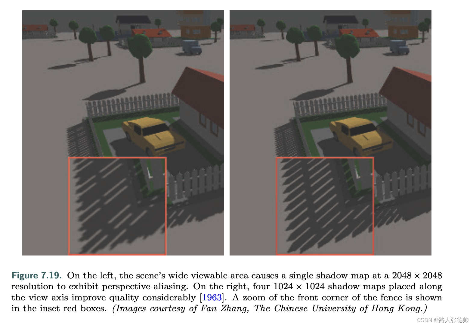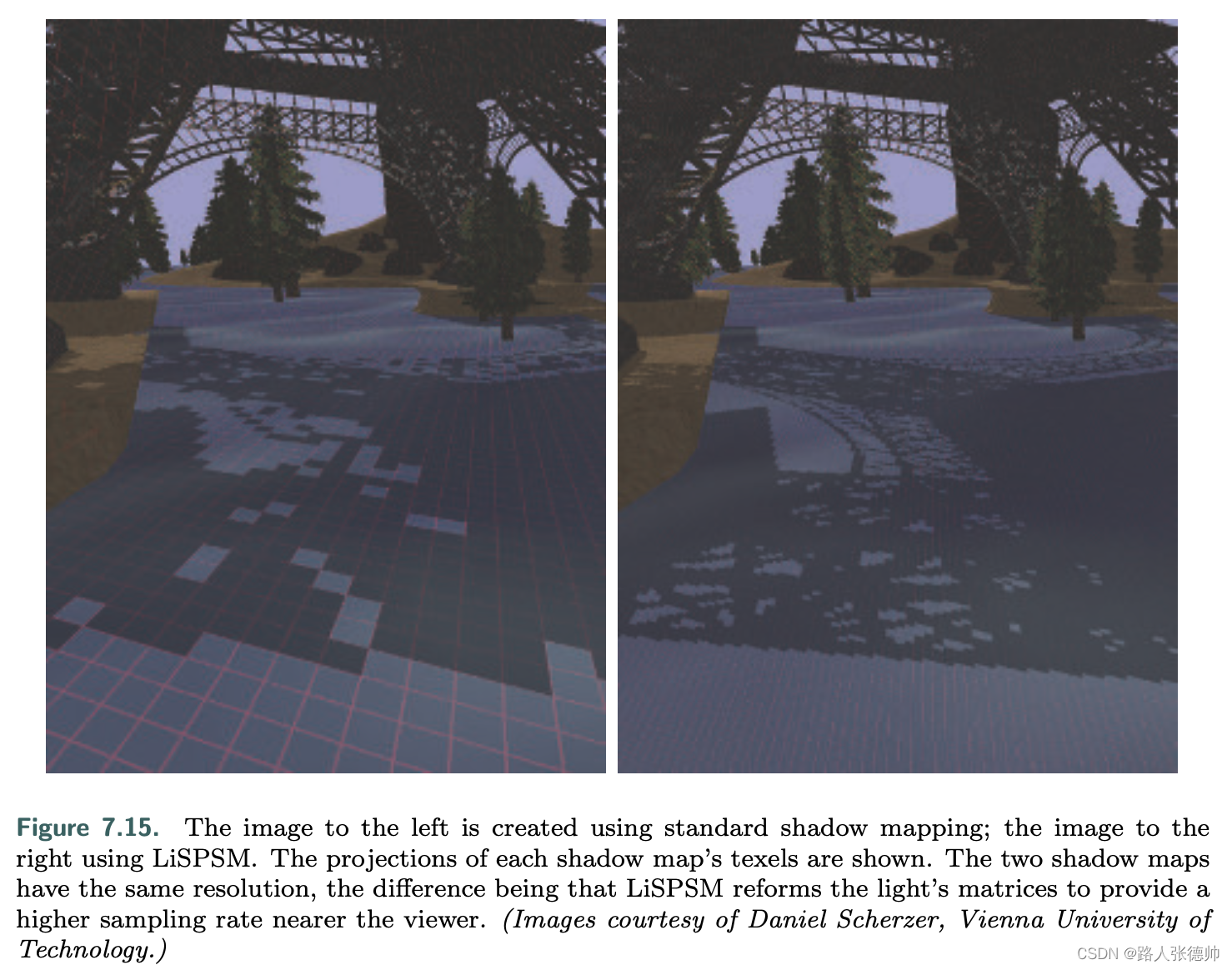 但是这种方法当光源在摄像机前面,并且照向摄像机的时候就会失效, 更靠近眼睛的地方需要更多的阴影贴图样本,但是线性扭曲只会使情况更糟[1555]. 还有阴影贴图的质量的突变,也是它不受欢迎的地方