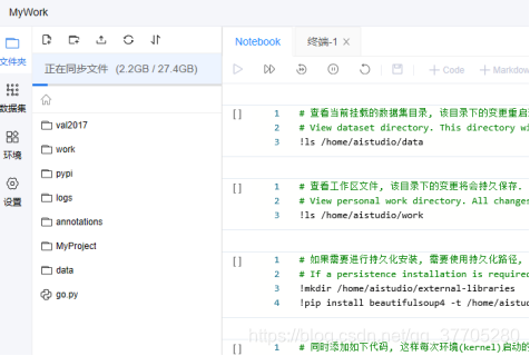 接下来是这样的主页,最左侧,可以在“环境”中创建终端,或这更换环境(也就是换配置),数据集就是我们在创建项目时上传的压缩包文件。我们可以在文件夹中创建自己的文件,如下图所示。