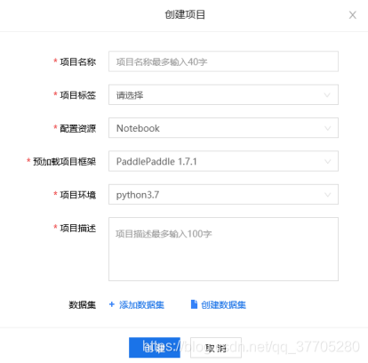 登录账号后,点击 “创建项目”,并选择环境。注意这里要选择 “Notebook”。使用 Notebook 才会获得每天免费的 12 小时算力。其他的内容自己填写。然后 先不要点击创建。