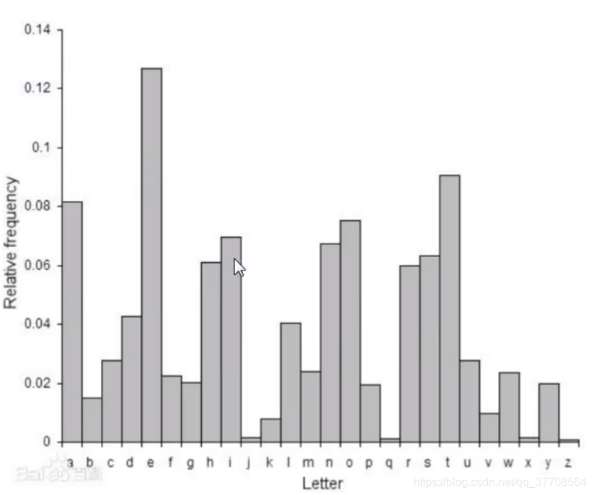 频率分析法:可以通过一段程序,来检测一篇文章中每个字母出现的次数,将得到的频率和上图(英文中常用字母进行匹配)那么久有可能得知其加密算法。
