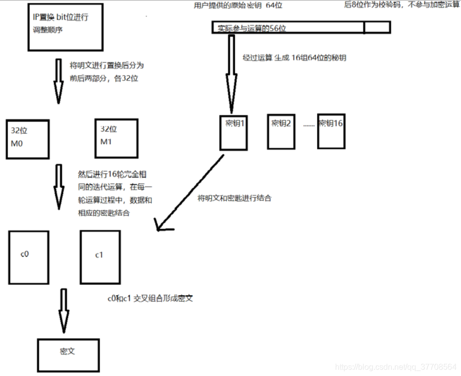 DES 对64位(bit)的明文分组M 进行操作,M经过一个初始置换IP,置换成M0,将M0明文分成左半部分和右半部分,各32位长。