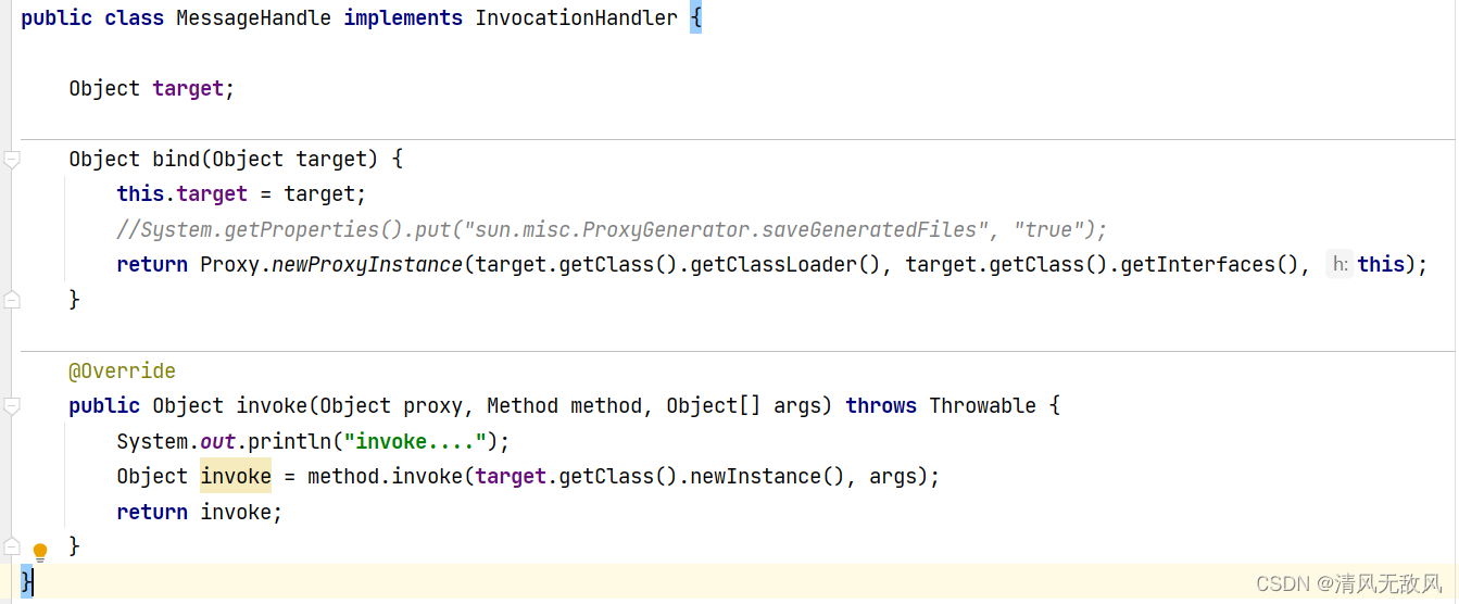 上边的super.h.invoke(),会调用如下 invoke(),因为InvocationHandle接口组合到 Proxy类中,故在创建代理类时传入的 InvocationHandle 对象会被赋值给Proxy的 InvocationHandle h ,而 h 运行时类型是 MessageHandle,因此会调用我们实现的invoke()方法。
