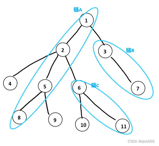 我们将这棵树拆分成了一共有三条长度大于1的链(链ABC),另外该图中未被划分进链中的单独节点我们也可以视为他是一个长度为1的链。