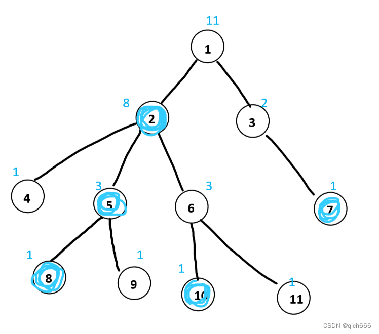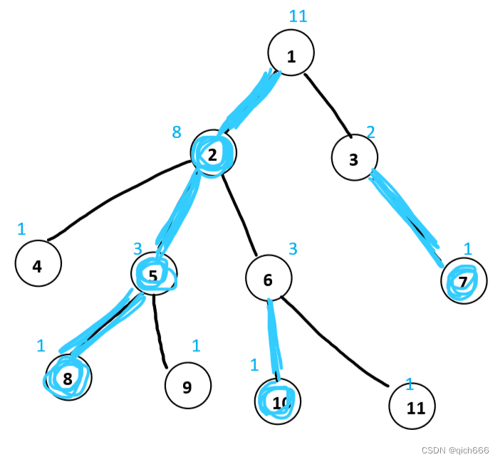 我们算出了以所有节点为根的子树大小,标注在了节点上方(蓝色字)。