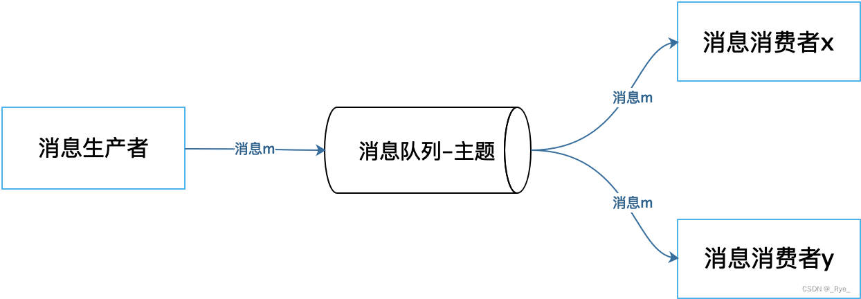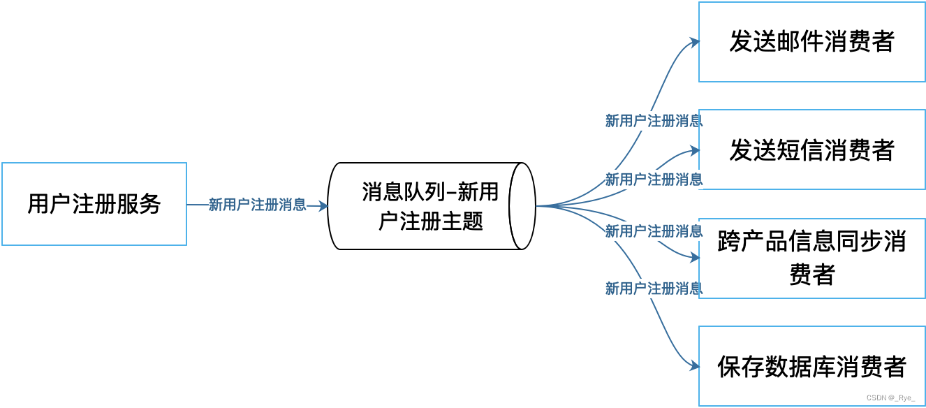 消息生产者向消息队列某个主题发布消息 m,多个消息消费者订阅该主题,就会分别收到这个消息 m。典型场景就是新用户注册,新用户注册的时候一方面需要发送激活邮件,另一方面可能还需要发送欢迎短信,还可能需要将用户信息同步给关联产品,当然还需要将用户信息保存到数据库中。