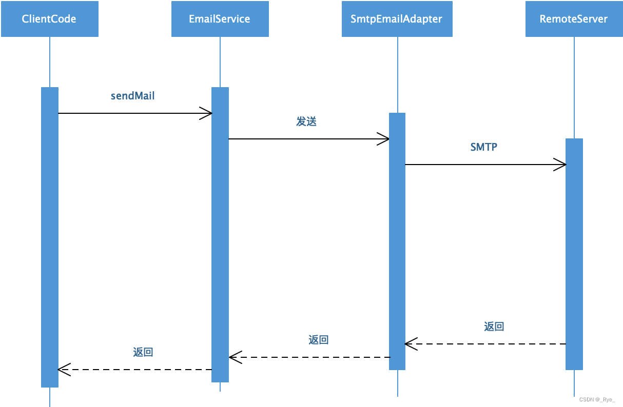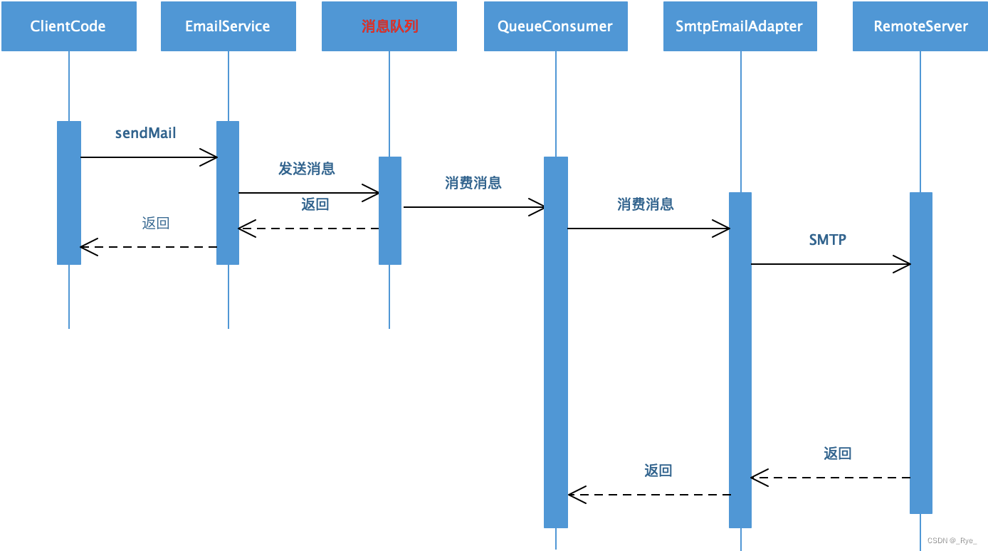 应用程序代码 ClintCode 需要发送邮件,调用接口服务 EmailService,实现了 EmailService 接口的 SmtpEmailAdapter 通过 SMTP 协议与远程服务器通信,远程邮件服务器可能有很多邮件在等待发送,当前邮件可能要等待较长时间才能发送成功,发送成功后再通过远程通信返回结果给应用程序。