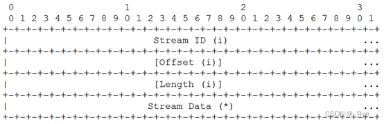 在上表中,我们只要分析 0x08-0x0f 这 8 种 STREAM 类型的 Frame,就能弄明白 Stream 流的实现原理,自然也就清楚队头阻塞是怎样解决的了。Stream Frame 用于传递 HTTP 消息,它的格式如下所示: